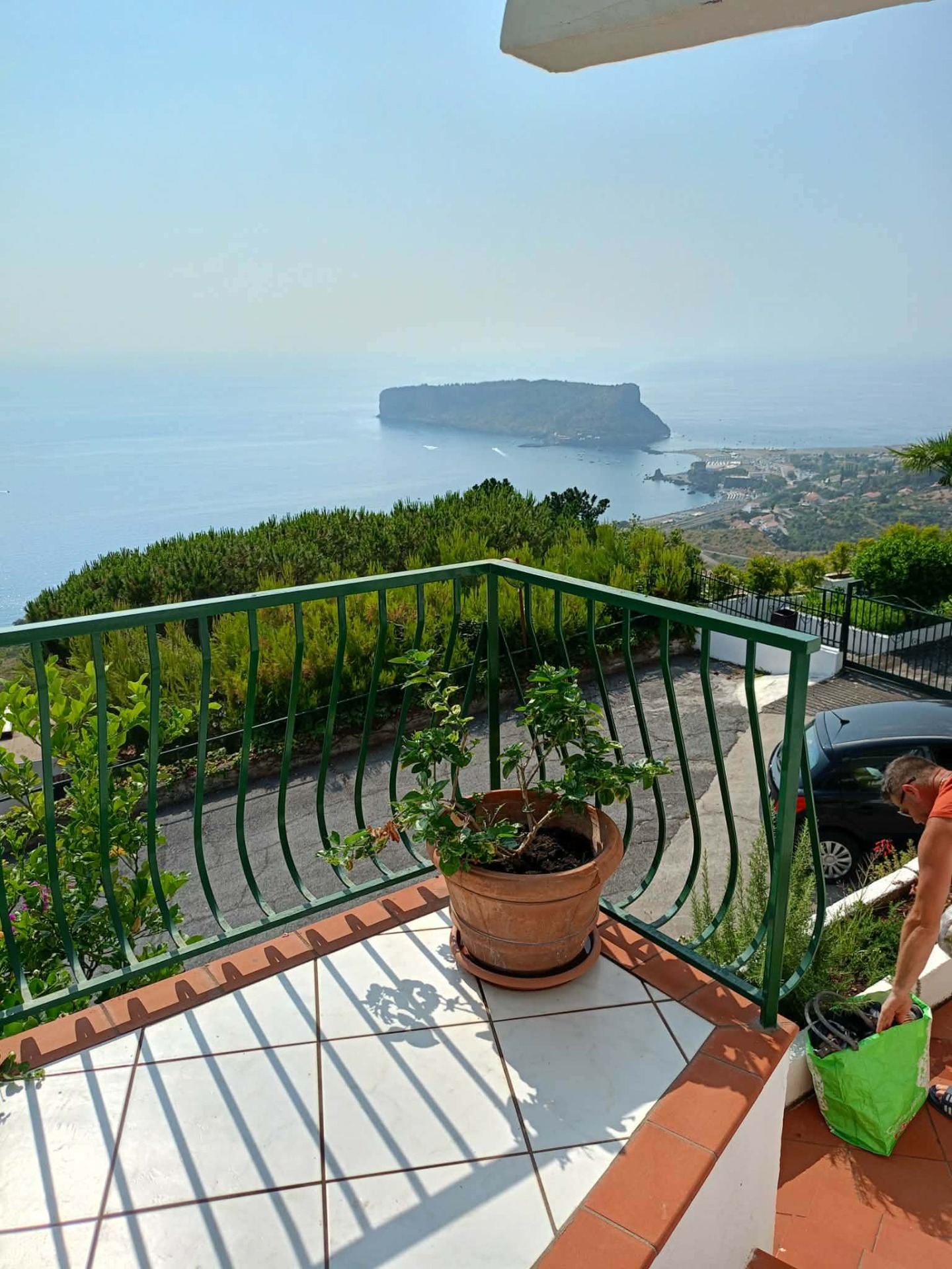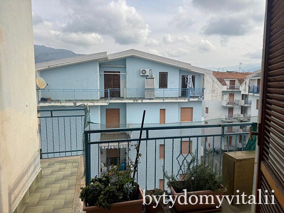 Apartmán před rekonstrukcí, se nachází ve čtvrtém patře bytového domu bez výtahu. Z velké terasy je výhled na 3 km vzdálené moře. V městečku Marcellina staví regionální vlaky ze Scalea.
